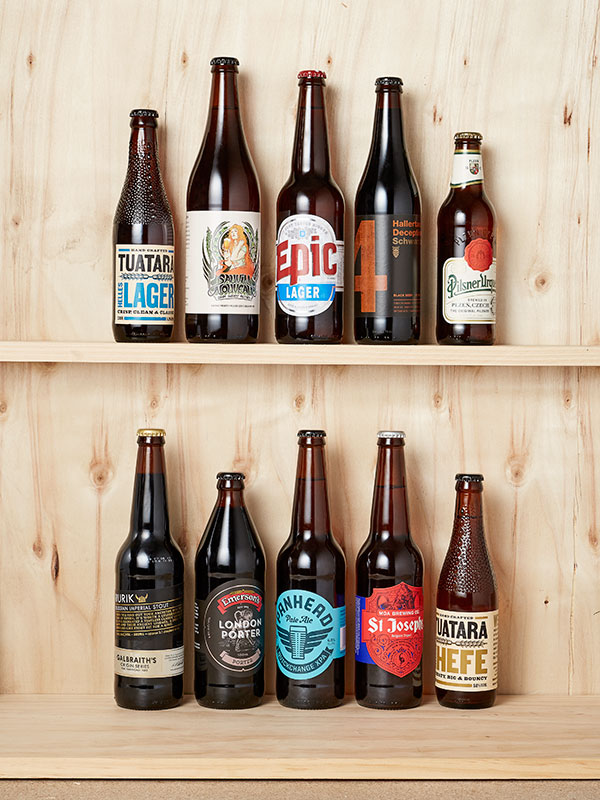 Lagers: Pilsner Urquell, Epic Lager, Hallertau Deception Shwarzbier, Invercargill Smokin’ Bishop, Garage Project Sauvin Nouveau.