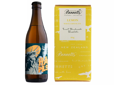 Strong hops, honeyed tropical fruits, and zesty citrus peel make Liberty Brewing Halo Pilsner a natural bedfellow with Bennetts of Mangawhai Lemon White Chocolate.