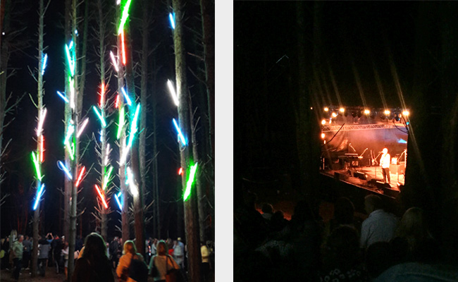 As darkness fell, Brown thanked everyone for coming before welcoming us to a wooded dell, lit with colourful lights and neon installations, to watch Dave Dobbyn and friends while tucked up in blankets, as waiters wearing retro-style usher trays served pots of Kohu Road ice cream made with chermoya fruit picked from the orchard.