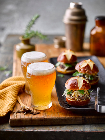 Our gotta-have-it food and drink combo for the event is a German bratwurst, pretzel and sauerkraut burger paired with Angelic Bier – a combination of Bombay Sapphire with passionfruit shrub and angelica honey, topped with beer and an orange blossom and hop spray (pictured below).