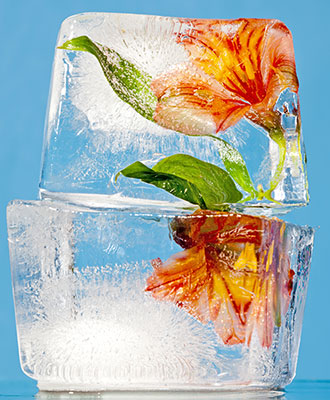 To suspend flowers inside the ice, use large ice cube moulds and place the flowers face-down. Fill quarter of the mould with water and freeze solid. Add water so the cube is half full and freeze again. Fill to the top and freeze a final time.