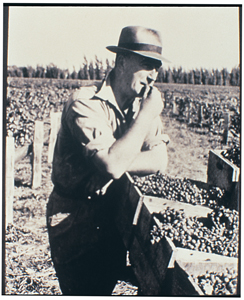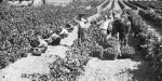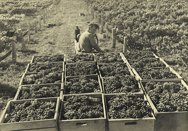 A grainy black and white photograph shows a group of men harvesting grapes among rows of vines, wooden barrels overflowing with fruit and a draft horse nearby. The image looks like a classic scene from the South of France or Italy, except for the macrocarpa tree, number 8 wire fence and hillock marked with sheep trails behind them.