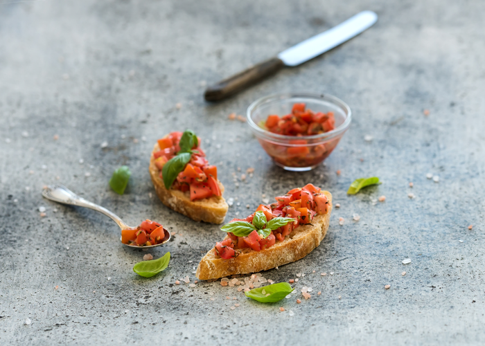 Chop tomatoes into fine cubes, pour over olive oil, add chopped fresh basil, salt & pepper. Slice the ciabatta into 2cm pieces and grill on hot plate or pan. Brush bread with olive oil, rub garlic clove over bread, spoon tomatoes on top, serve immediately.