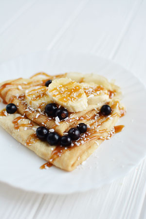 Pancakes with blueberries, bananas and a drizzle of Toast’s Caramel Whisky Sauce (recipe below).