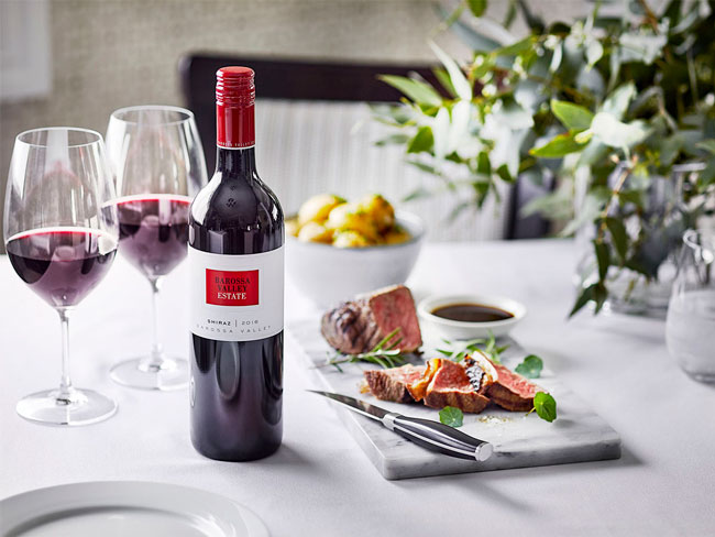 Enjoy Barossa Valley Estate Shiraz on its own or match with juicy, tender steak, lamb and charcuterie, spicy, smoky and barbecue flavours, béarnaise and peppercorn sauces, and aged cheeses. Delicious.